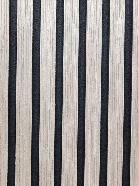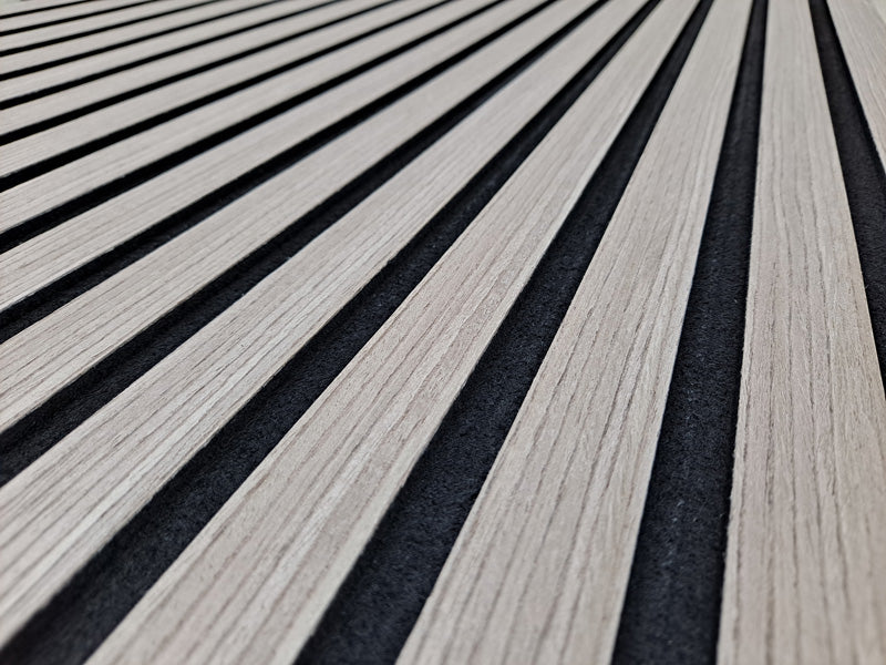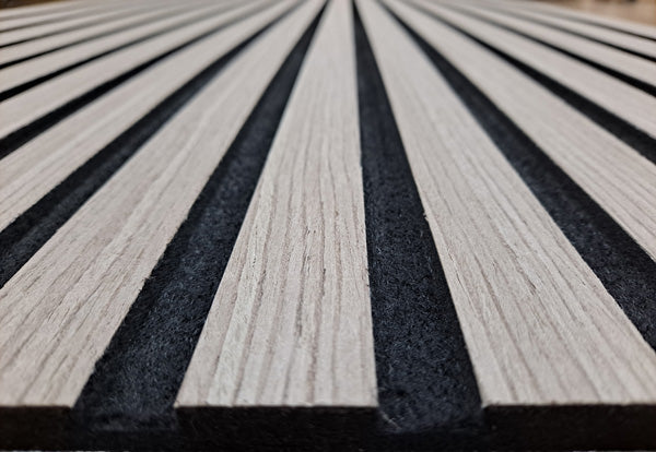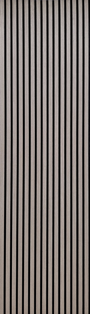 There are two pieces that make up a full panel – Panel A measures 11.025″ x 94.488″ and Panel B measures 12.6″ x 94.488″ The full SoundGroove panel, put together measures 94.488″ x 23.622″. The wooden slats are 1.06″ wide and the distance of 0.511″ between them