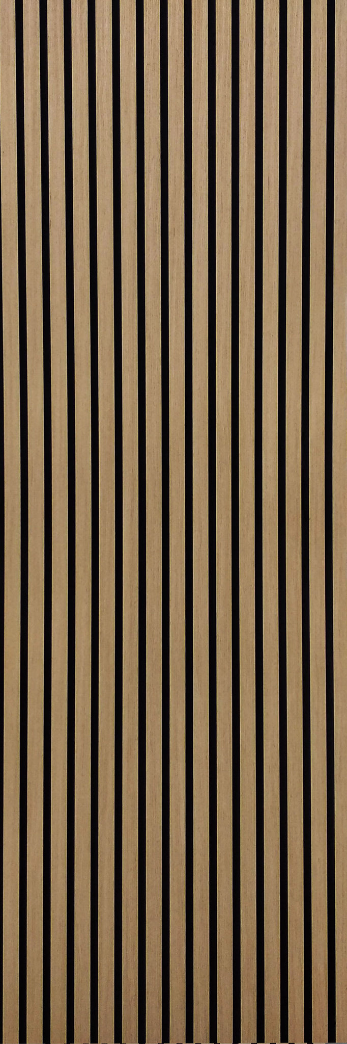 There are two pieces that make up a full panel – Panel A measures 11.025″ x 94.488″ and Panel B measures 12.6″ x 94.488″ The full SoundGroove panel, put together measures 94.488″ x 23.622″. The wooden slats are 1.06″ wide and the distance of 0.511″ between them